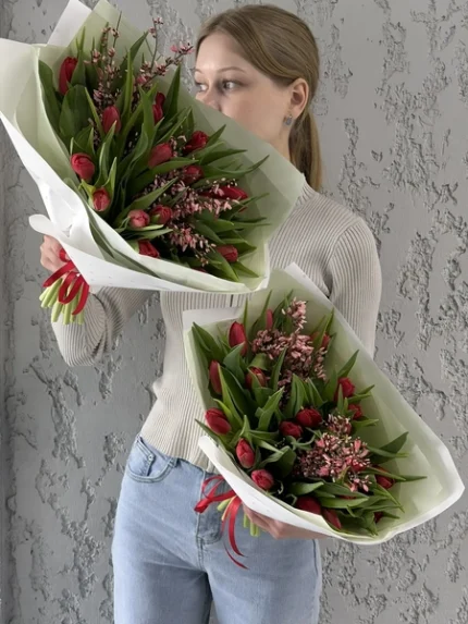 Букет с тюльпанами, Женщине, Коллегам, Красный, Любимой, Маме, Подруге, Сестре, Тюльпаны, Цветы бабушке, Цветы врачу, Цветы девушке, Цветы дочери, Цветы жене, Цветы любовнице, Цветы руководителю, Цветы свекрови, Цветы тёще, Цветы учительнице, Новая коллекция