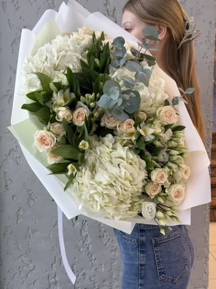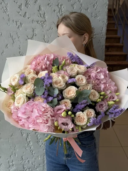 Дуо букет из воздушной гортензии и нежной кустовой розы