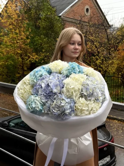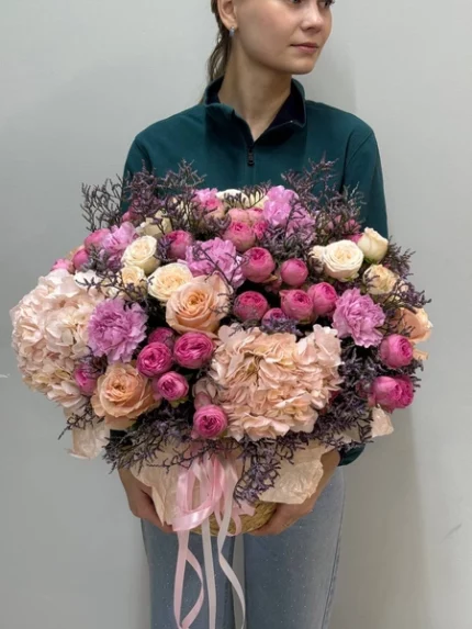 Состав букета: гортензия (2 шт.), хамелациум (4 шт.), альстромерия (5 шт.), диантус (5 шт.), эустома (6 шт.), кустовая роза (4 шт.) и упаковка.