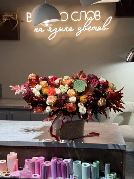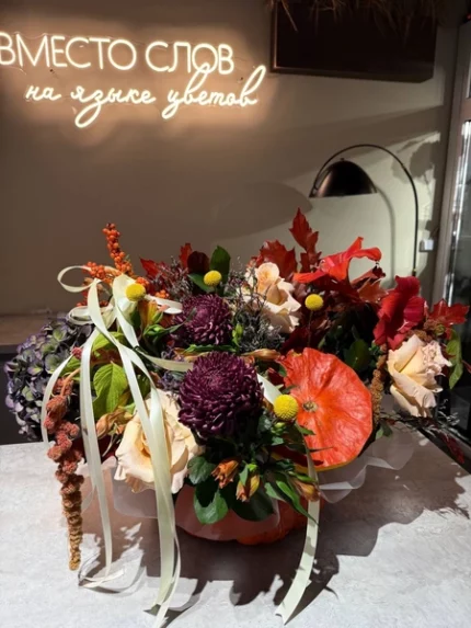 Состав букета: одноголовая хризантема (5 шт.), гуерк (3 шт.), гортензия (1 шт.), сафари (1 шт.), амарантус (2 шт.), альстромерия (6 шт.), илекс (1 шт.), амариллис (1 шт.), одноголовая роза (3 шт.), краспедия (5 шт.), рускус (5 шт.), лимониум (3 шт.) и тыква.