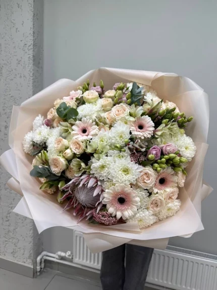 Состав букета: протея (1 шт.), гербера (5 шт.), эвкалипт (12 шт.), альстромерия (7 шт.), кустовая роза (9 шт.), эустома (9 шт.), кустовая хризантема (9 шт.), озотамнус (3 шт.) и упаковка.