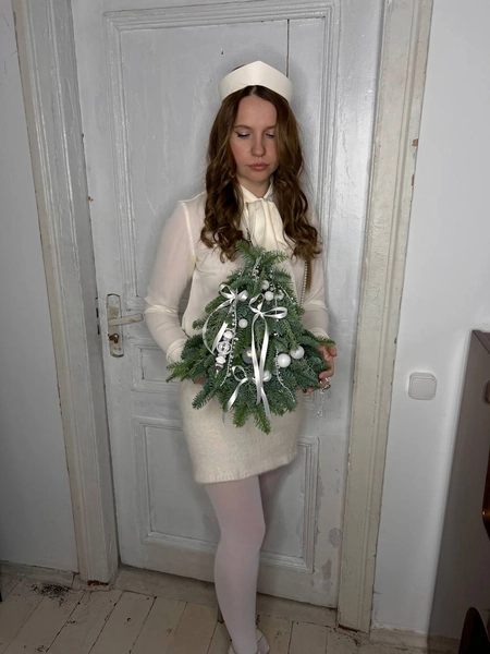 Новогодняя ель ручной работы, выполненная из веток датской ели Нобилис. Декорирована в белой гамме. При правильном уходе ель порадует 3-4 недели.