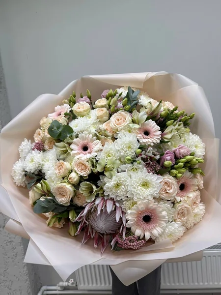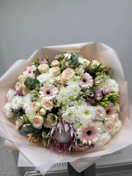 Состав букета: протея (1 шт.), гербера (5 шт.), эвкалипт (12 шт.), альстромерия (7 шт.), кустовая роза (9 шт.), эустома (9 шт.), кустовая хризантема (9 шт.), озотамнус (3 шт.) и упаковка.