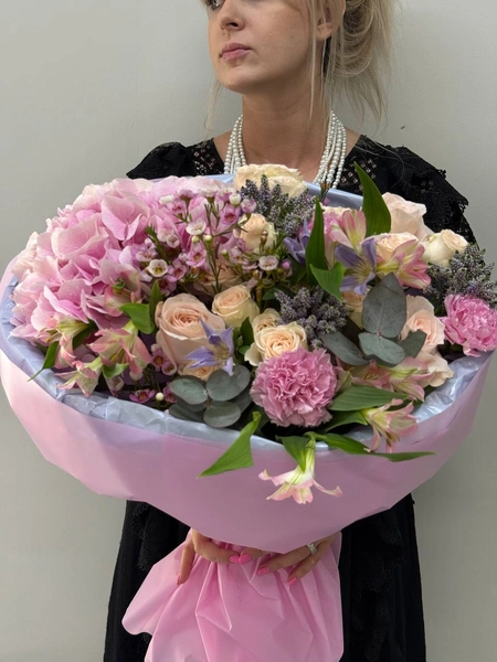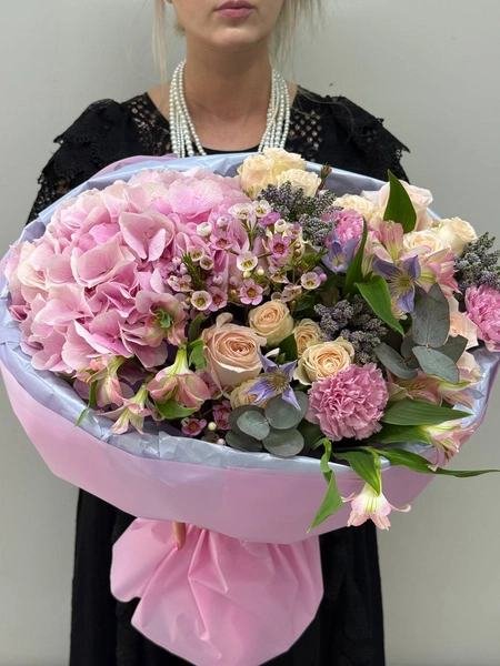 Этот букет пленит своей нежностью и роскошью. В нем прекрасно сочетаются крупные соцветия гортензии, оттеняющие розовые и кремовые розы, которые излучают теплоту и уют. Добавляют изысканности легкие акценты фиолетовых альстромерий и зелени эвкалипта. Густые гортензии, словно облака, окутывают букет, создавая атмосферу весенней свежести. Этот букет идеально подойдет для романтического свидания, в качестве подарка любимому человеку или для создания уютной обстановки в вашем доме. Мы свяжемся с вами в течении 30 минут после оформления заявки. Если заказ необходимо выполнить срочно, перезвоните нам по телефону +79774286477.