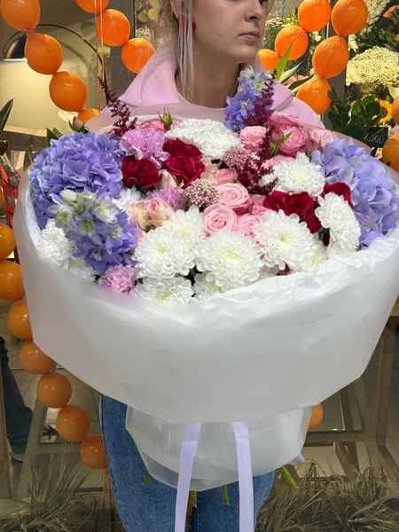 Состав букета: гортензия (2 шт.), астильба (3 шт.), дельфиниум (2 шт.), диантус (3 шт.), кустовая хризантема (5 шт.), кустовая роза (7 шт.), озотамнус (2 шт.) и упаковка.