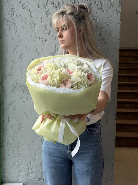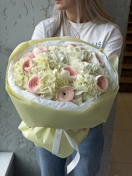 Состав букета: гортензия (6 шт.), ранункулюс (7 шт.), упаковка (1 шт.)