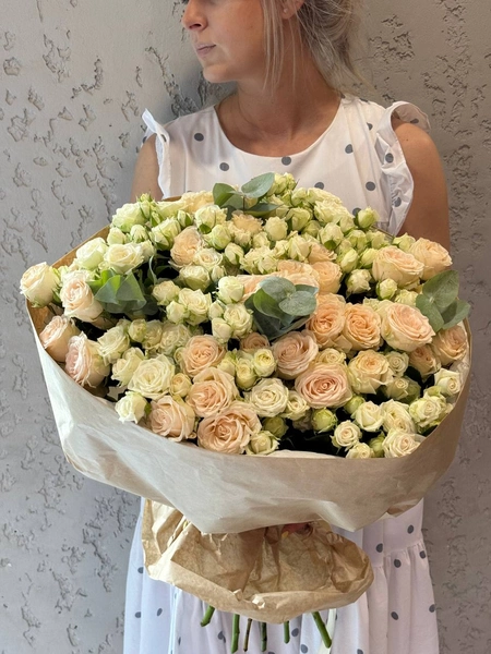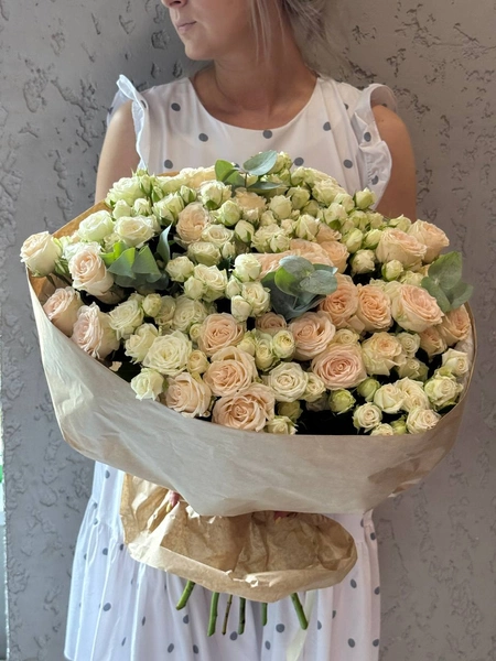 Состав букета: кустовые розы (25 шт.), эвкалипт (5 шт.) и упаковка.