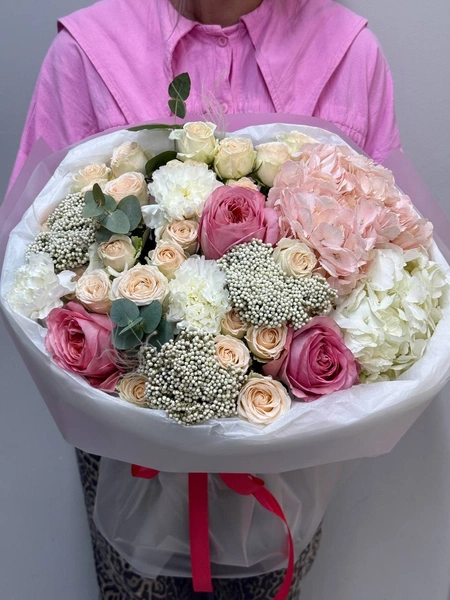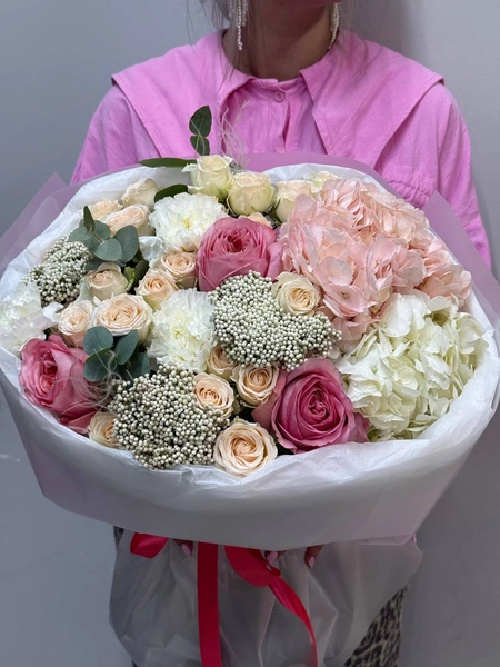Состав букета: гортензия (2 шт.), кустовая роза (4 шт.), озотамнус (3 шт.), диантус (3 шт.), одноголовая роза (3 шт.), эвкалипт (3 шт.) и упаковка.