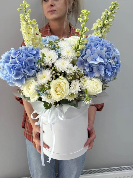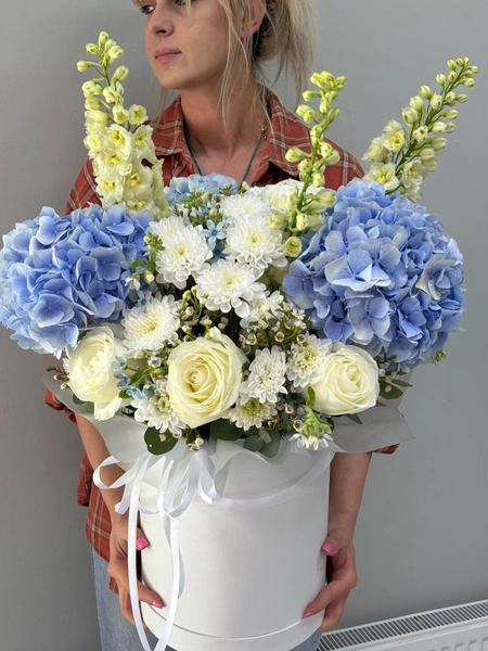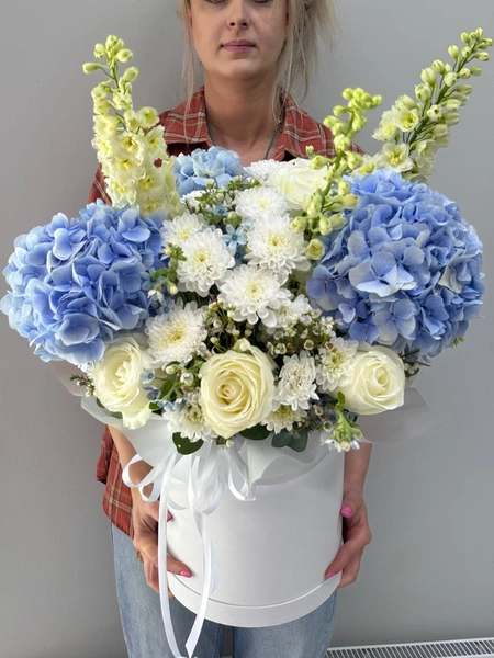 Состав букета: гортензия Голландия (3 шт.), одноголовая роза (5 шт.), кустовая хризантема (3 шт.), хамелациум (3 шт.), оксипеталум (5 шт.), дельфиниум (3 шт.), эвкалипт (3 шт.) и коробка.