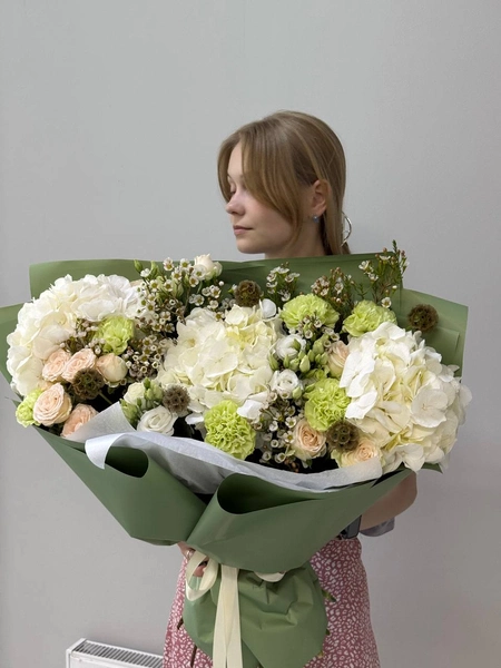 Этот восхитительный букет очаровывает своей нежностью и свежестью. В нем гармонично сочетаются крупные белые гортензии, утонченные кремовые розы и изящные зеленые диантусы. Все цветы аккуратно обрамлены стильной зеленой упаковкой, которая подчеркивает их природную красоту. Букет идеально подойдет для создания легкой и воздушной атмосферы на любом торжестве, а также станет прекрасным подарком для тех, кто ценит естественную элегантность. Мы свяжемся с вами в течении 30 минут после оформления заявки. Если заказ необходимо выполнить срочно, перезвоните нам по телефону +79774286477.