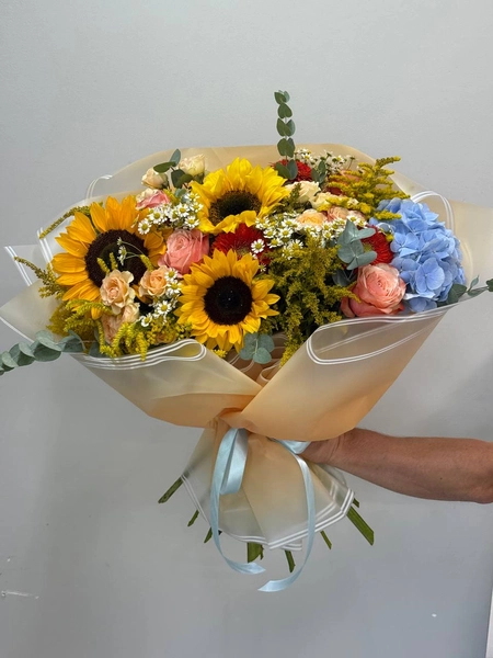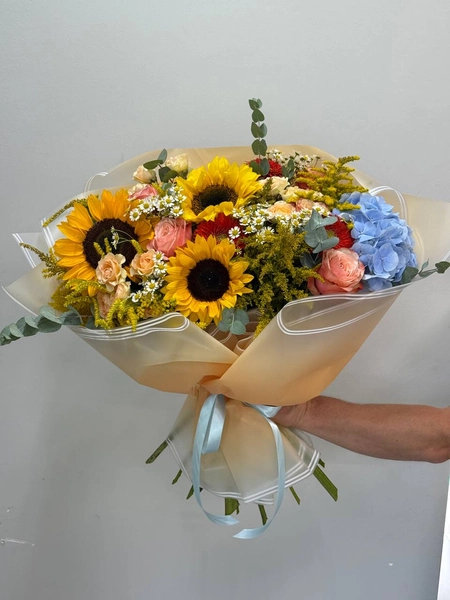 Этот яркий и жизнерадостный букет создан для тех, кто хочет внести в свою жизнь немного солнечного тепла. В центре букета подсолнухи, символизирующие надежду и радость. Они окружены нежными розами пастельных оттенков и легкими миниатюрными ромашками, которые добавляют легкости и воздушности. Синие гортензии создают контраст и яркость, а зелень придают букету естественность и объём. Мы свяжемся с вами в течении 30 минут после оформления заявки. Если заказ необходимо выполнить срочно, перезвоните нам по телефону +79774286477.