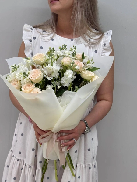 Этот изысканный букет точно передаёт атмосферу лёгкости и романтики. Кремовые розы, белоснежные альстромерии и воздушная кустовая маттиола украшает букет, создавая нежное сочетание пастельных оттенков, символизирующее утончённость и гармонию. Идеально подойдёт для особенных моментов, когда хочется выразить свои искренние чувства. Мы свяжемся с вами в течении 30 минут после оформления заявки. Если заказ необходимо выполнить срочно, перезвоните нам по телефону +79774286477.