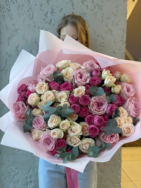 Этот нежный и романтичный букет — воплощение изысканности и любви. Он состоит из розовых и кремовых роз, тщательно собранных в гармоничную композицию. Среди изумительных цветов спрятались веточки эвкалипта, которые добавляют свежесть и природное очарование. Букет подойдет для особенных моментов, когда словами невозможно выразить всю палитру чувств. Мы свяжемся с вами в течении 30 минут после оформления заявки. Если заказ необходимо выполнить срочно, перезвоните нам по телефону +79774286477.