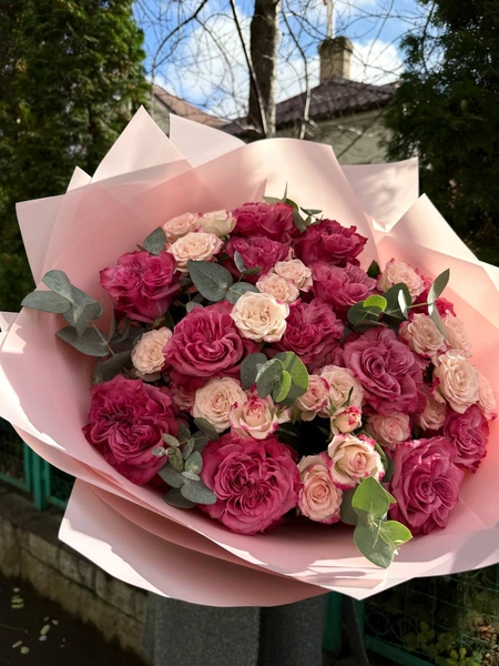 Состав букета: одноголовая роза (13 шт.), кустовая роза (6 шт.), эвкалипт (8 шт.) и упаковка.