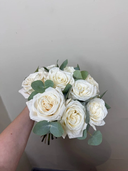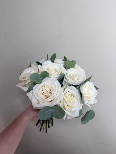 Состав букета: розы (9 шт.), эвкалипт (11 шт.) и лента.
