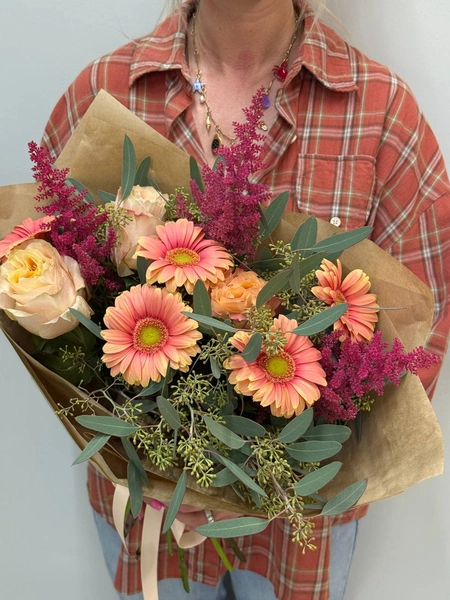 Состав букета: одноголовая роза (3 шт.), гербера (5 шт.), астильба (3 шт.), эвкалипт (3 шт.) и упаковка.