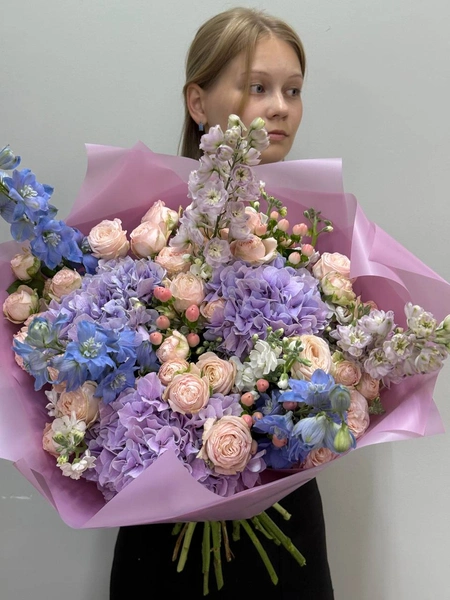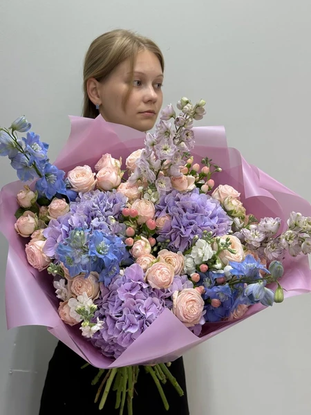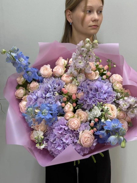 В букете собраны нежные оттенки роз, гортензий и дельфиниума, создающие атмосферу легкости и романтики. Искусно подобранные светло-розовые кустовые розы и сиреневые гортензии прекрасно гармонируют между собой, а синие нотки дельфиниума добавляют свежести и глубины. Такой букет станет идеальным подарком для особенного случая или просто способом порадовать близкого человека. Мы свяжемся с вами в течении 30 минут после оформления заявки. Если заказ необходимо выполнить срочно, перезвоните нам по телефону +79774286477.