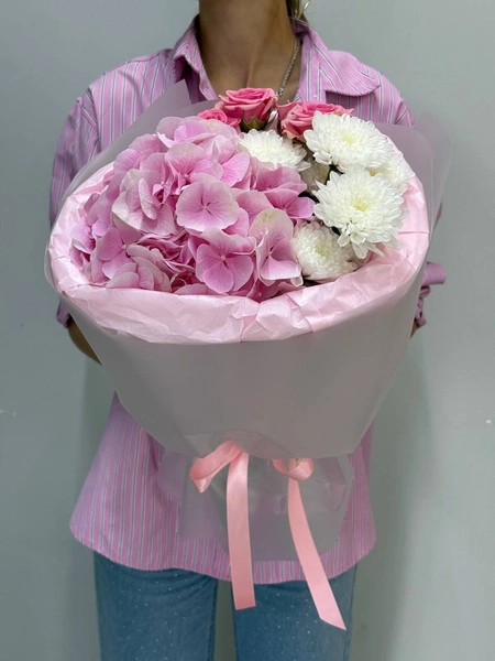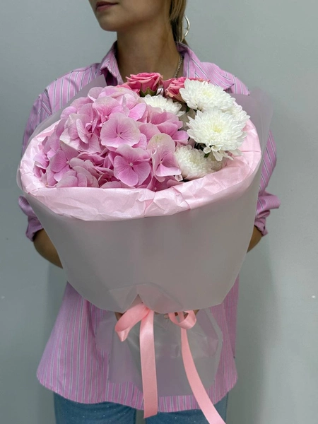 Состав букета: гортензия (1 шт.), кустовая хризантема (1 шт.), кустовая роза (1 шт.), упаковка