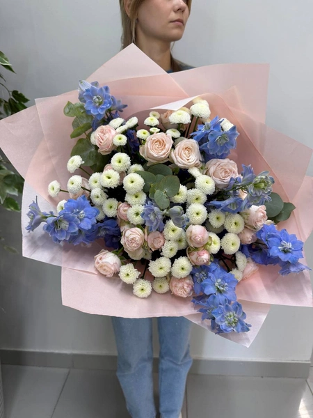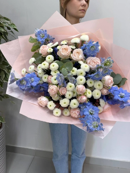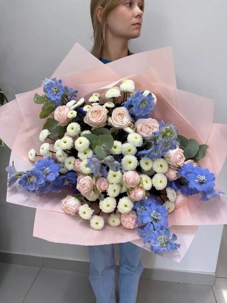 Воздушный букет в пастельной гамме. Нежные пудровые кустовые розы сочетаются с белыми сантини и небесно‑голубым дельфиниумом, а свежая зелень эвкалипта добавляет природной прохлады. Композиция напоминает рассветное небо — лёгкая, романтичная и очень выразительная. Подойдёт для дня рождения, романтического повода, выписки из роддома или просто чтобы сказать «я рядом». Мы свяжемся с вами в течении 30 минут после оформления заявки. Если заказ необходимо выполнить срочно, перезвоните нам по телефону +79774286477.
