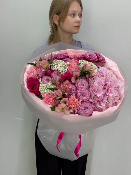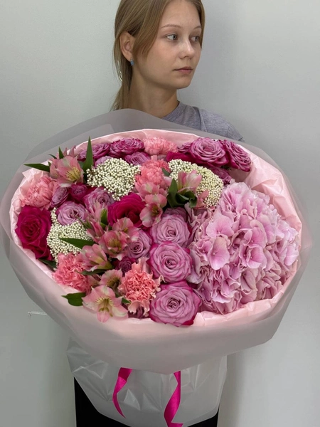Этот потрясающий букет представляет собой нежное сочетание различных оттенков розового, воплощая в себе элегантность и утонченность. Букет включает в себя роскошные розы, пышные гортензии и изысканные альстромерии, которые вместе создают атмосферу романтики и глубокой привязанности. Украшенный декоративной зеленью и белым озотамнусом, этот букет станет идеальным подарком для особых случаев или просто чтобы порадовать дорогого человека. Мы свяжемся с вами в течении 30 минут после оформления заявки. Если заказ необходимо выполнить срочно, перезвоните нам по телефону +79774286477.