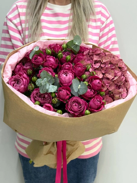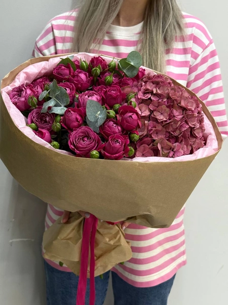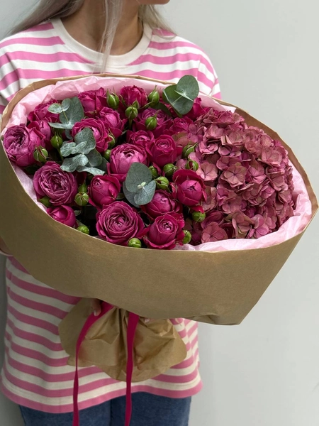 Состав букета: кустовая роза (6 шт.), гортензия (1 шт.), эвкалипт (3 шт.) и упаковка.
