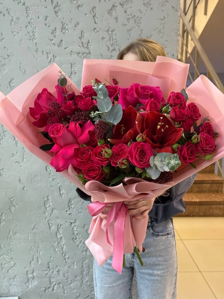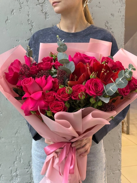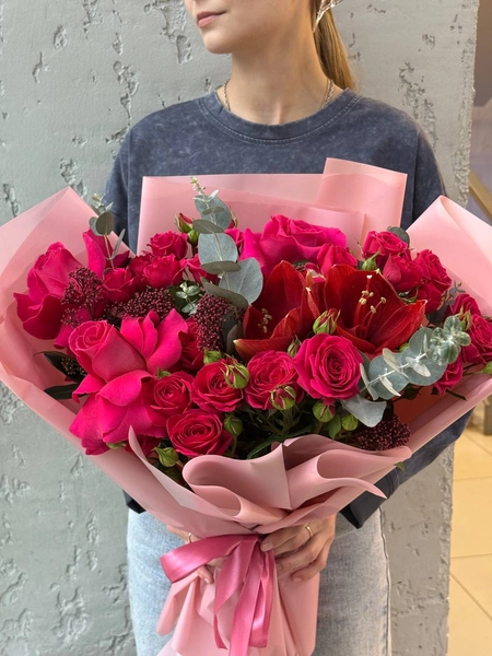 Состав букета: одноголовая роза (3 шт.), скиммия (2 шт.), кустовая роза (5 шт.), амариллис (1 шт.), эвкалипт (3 шт.) и упаковка.