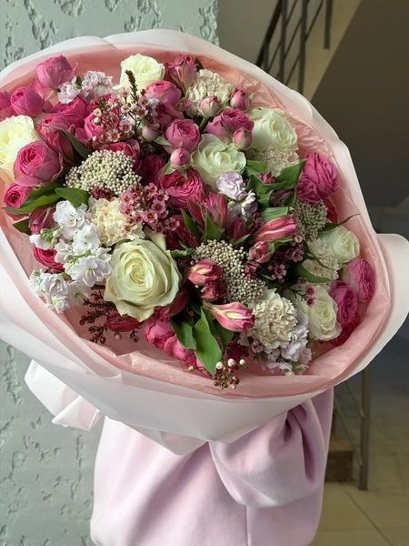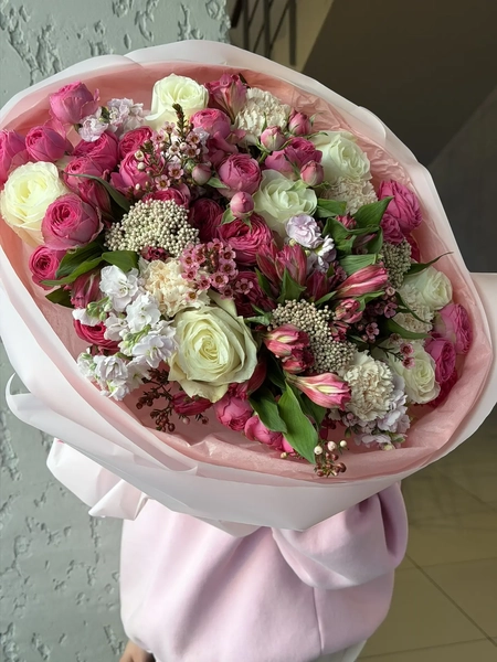 Состав букета: одноголовая роза (7 шт.), альстромерия (5 шт.), кустовая маттиола (4 шт.), озотамнус (2 шт.), хамелациум (1 шт.), кустовая роза (10 шт.), диантус (3 шт.), упаковка (1 шт.)