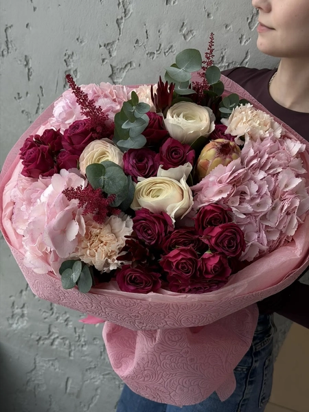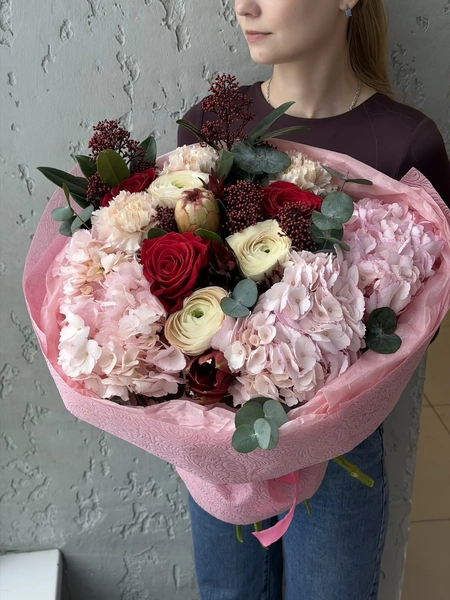 Состав букета: ранункулюс (3 шт.), амариллис (1 шт.), протея (1 шт.), гортензия (3 шт.), скимия (3 шт.), сафари (3 шт.), диантус (3 шт.), одноголовая роза (3 шт.), эвкалипт (6 шт.), упаковка (1 шт.)