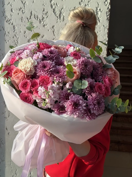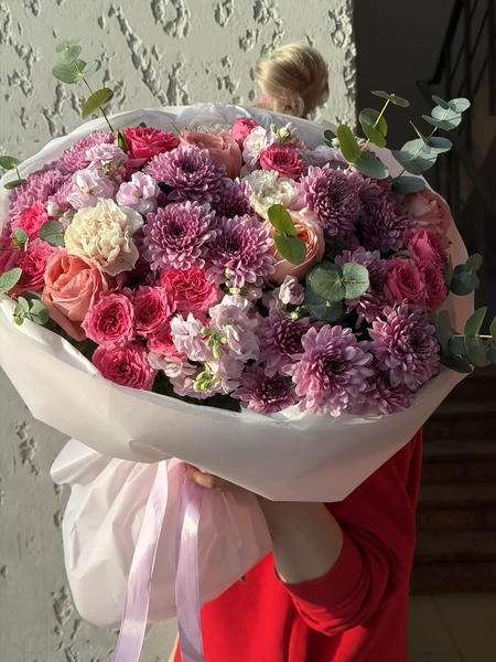 Состав букета: кустовая хризантема (4 шт.), одноголовая роза (5 шт.), кустовая роза (5 шт.), маттиола кустовая (3 шт.), диантус (3 шт.), эвкалипт (4 шт.), упаковка (1 шт.)