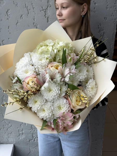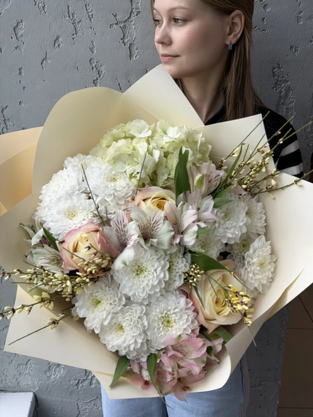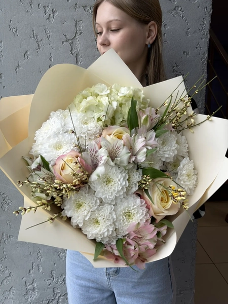 Состав букета: кустовая хризантема (3 шт.), гортензия (1 шт.), одноголовая роза (3 шт.), альстромерия (3 шт.), гениста (3 шт.), упаковка (1 шт.)
