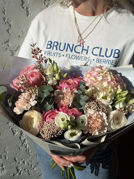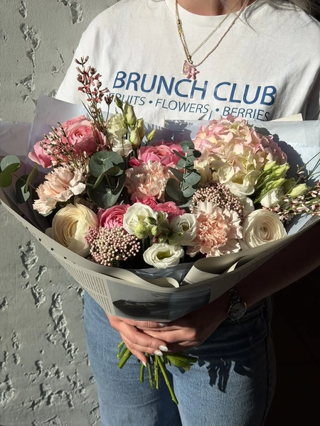 Состав букета: гортензия (1 шт.), кустовая роза (3 шт.), ранункулюс (3 шт.), эустома (3 шт.), диантус (3 шт.), гениста (3 шт.), эвкалипт (1 шт.), упаковка (1 шт.)