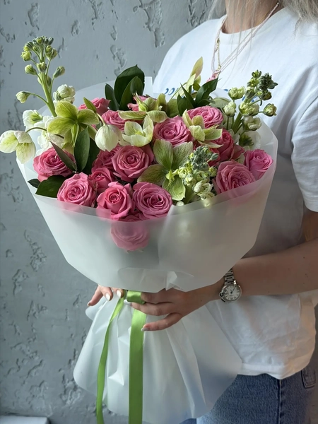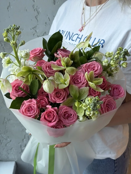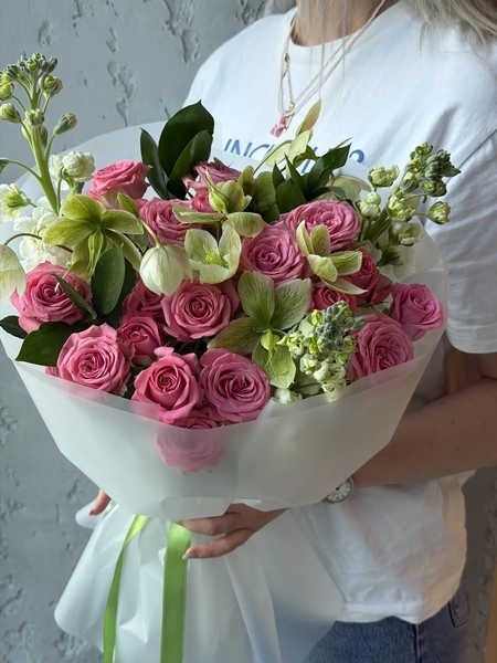 Состав букета: кустовая роза (4 шт.), маттиола (3 шт.), рускус (3 шт.), хелеборус (2 шт.), упаковка (1 шт.)