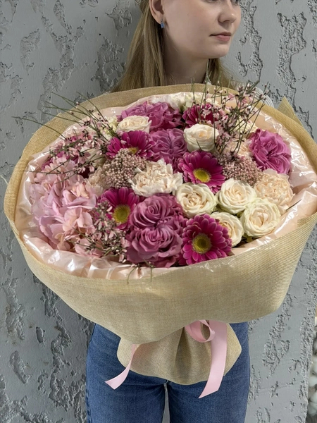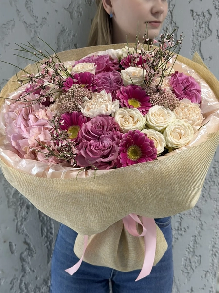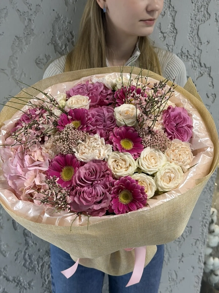 Состав букета: одноголовая роза (5 шт.), гербера (5 шт.), озотамнус (2 шт.), гениста (3 шт.), кустовая роза (3 шт.), диантус (5 шт.), упаковка (1 шт.)