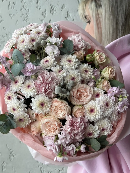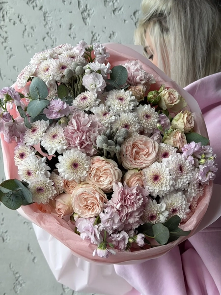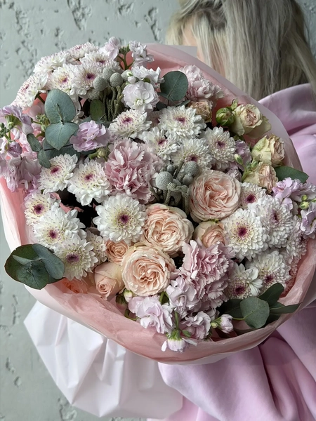 Состав букета: кустовая хризантема (4 шт.), эвкалипт (5 шт.), кустовая роза (3 шт.), маттиола кустовая (3 шт.), диантус (3 шт.), бруния (2 шт.), упаковка (1 шт.)