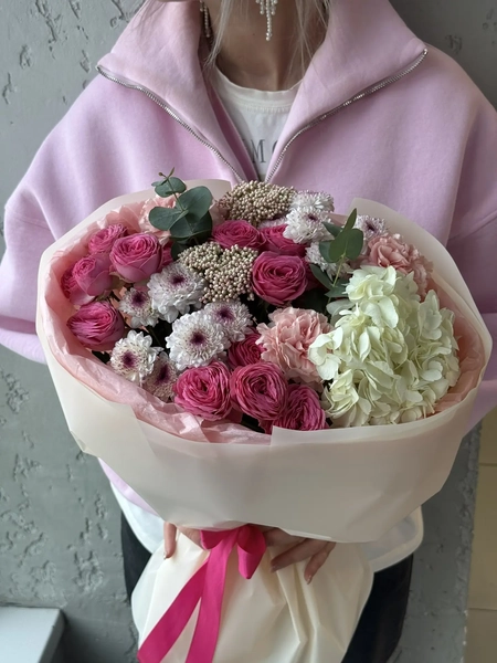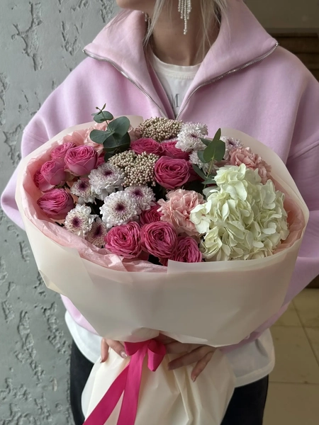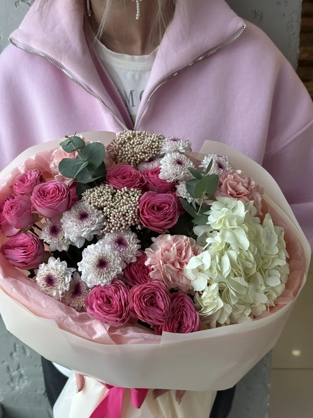 Состав букета: гортензия (1 шт.), сантини (2 шт.), кустовая роза (3 шт.), диантус (3 шт.), озотамнус (2 шт.), эвкалипт (3 шт.), упаковка (1 шт.)