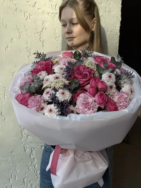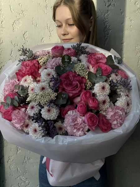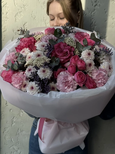 Состав букета: роза одноголовая (3 шт.), кустовая роза (3 шт.), сантини (5 шт.), лимониум (1 шт.), диантус (5 шт.), эвкалипт (5 шт.), озотамнус (3 шт.), упаковка (1 шт.)