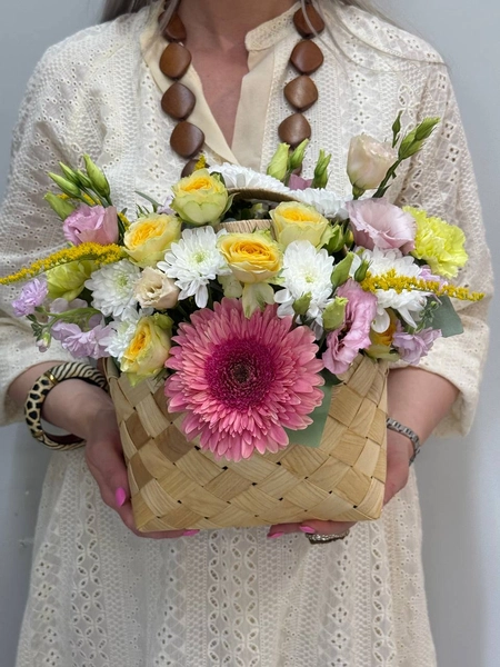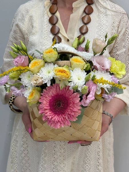 Эта нежная композиция в плетеной корзинке воплощает мягкость весеннего утра, наполненного солнечными лучами и гармонией природы. Яркая гербера в центре — словно акцент солнечного света, окруженная утонченными розами пастельных оттенков, нежными хризантемами и эустомой. Оттенки желтого, розового и белого создают умиротворяющую палитру, а корзинка добавляет нотку домашнего уюта. Букет идеально подойдет для подарка на праздник или для того, чтобы просто выразить радость и тепло близкому человеку.