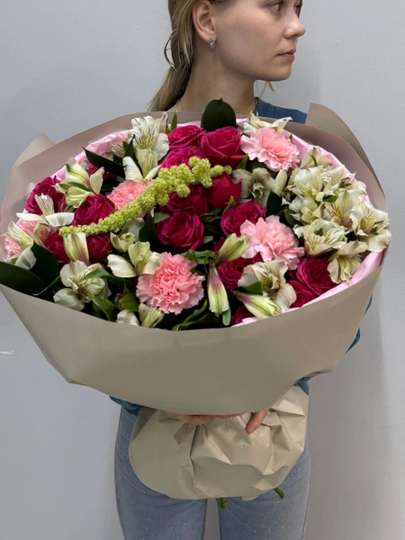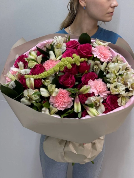 Состав букета: кустовая роза (4 шт.), диантус (5 шт.), альстромерия (5 шт.), рускус (3 шт.), амарантус (1 шт.) и упаковка.