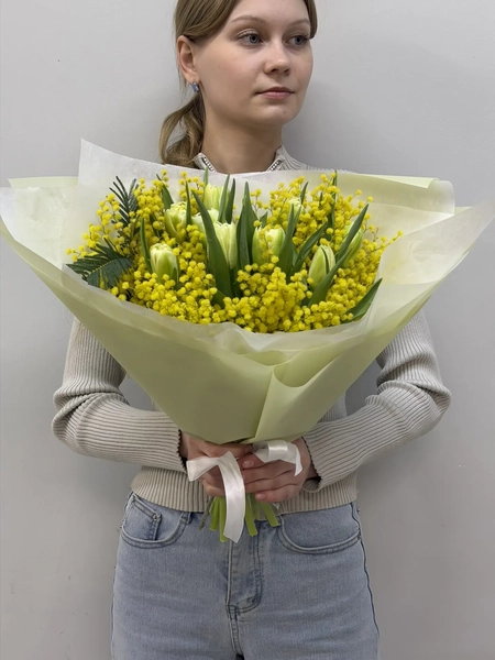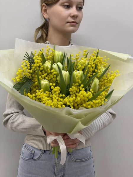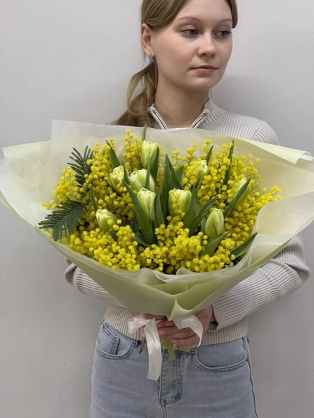 Состав букета: тюльпан (9 шт.), мимоза (1 шт.), упаковка (1 шт.)