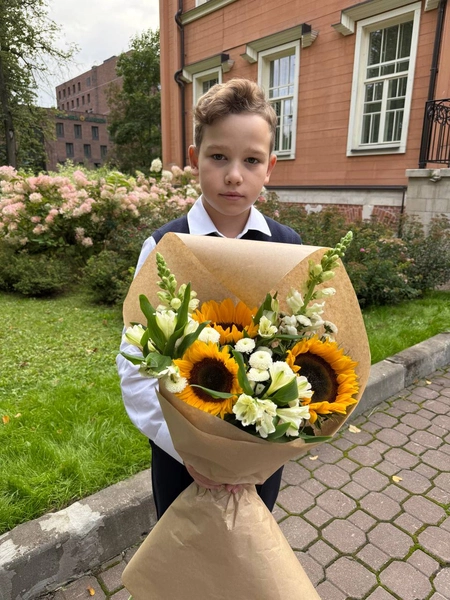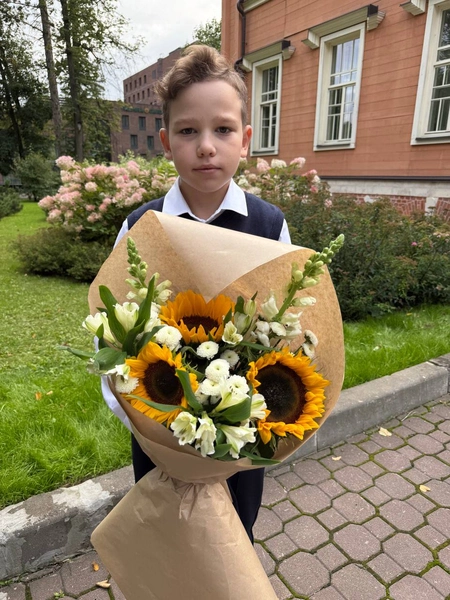 Состав букета: антиринум (2 шт.), альстромерии (3 шт.), подсолнух (3 шт.), сантини (3 шт.), упаковка