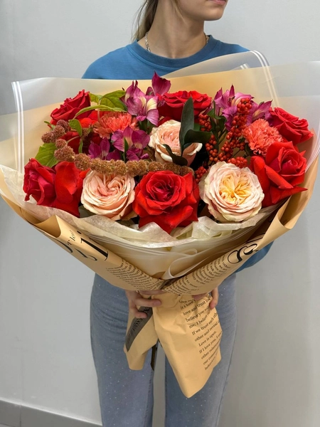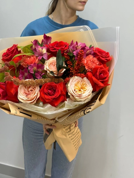 Состав букета: одноголовая роза (9 шт.), диантус (3 шт.), илекс (1 шт.), альстромерия (3 шт.), амарантус (1 шт.), рускус (5 шт.) и упаковка.