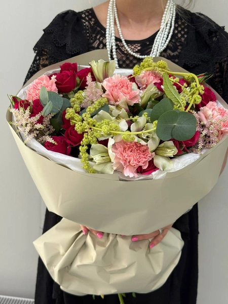 Состав букета: кустовая роза (4 шт.), диантус (5 шт.), альстромерия (3 шт.), эвкалипт (3 шт.), амарант (1 шт.), астильба (3 шт.) и упаковка.