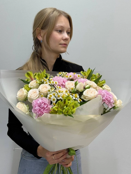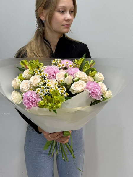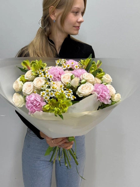 Этот букет – истинное воплощение весенней свежести и нежности. В центре внимания мягкие персиковые розы, окруженные трогательными розовыми гвоздиками, которые привносят атмосферу романтики и светлого настроения. Лёгкость и воздушность добавляют милые белые ромашки и нежная зелень альстромерий, создавая гармонию весеннего танца цветов. Такой букет станет идеальным подарком для выражения нежных чувств и создаст атмосферу заботы и тепла. Мы свяжемся с вами в течении 30 минут после оформления заявки. Если заказ необходимо выполнить срочно, перезвоните нам по телефону +79774286477.