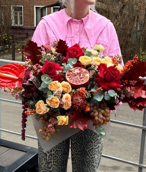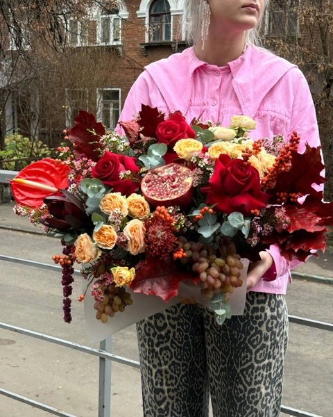 Состав букета: илекс (1 шт.), кустовая роза (5 шт.), сафари (1 шт.), гуерк (4 шт.), леуко (1 шт.), антуриум (1 шт.), амарантус (1 шт.), одноголовая роза (3 шт.), хамелациум (3 шт.), эвкалипт (3 шт.), фрукты и корзина.