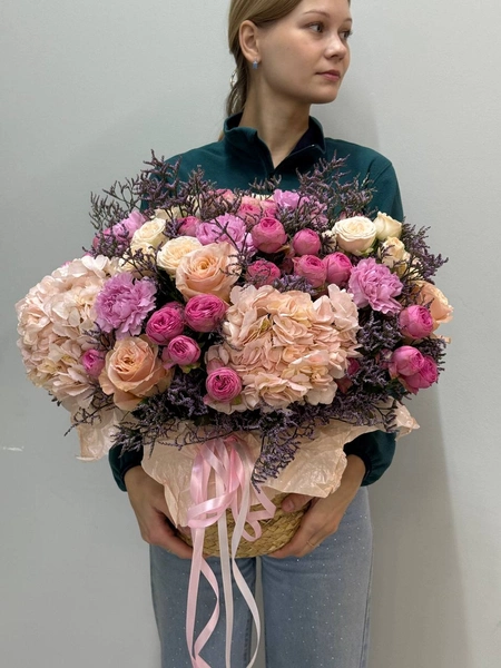 Состав букета: кустовая роза (11 шт.), гортензия (3 шт.), диантус (9 шт.), одноголовая роза (5 шт.), лимониум (8 шт.) и корзина.