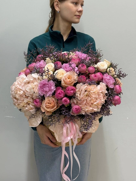 Этот великолепный букет сочетает в себе утонченную нежность розовых оттенков и богатство природы. Его основа выполнена из роскошных пионовидных роз, плавно переходящих в кремовые и нежно-розовые гортензии. Яркость букета подчеркивают воздушные кустовые розы и элегантные веточки декоративной зелени лимониума, создавая объем и шарм. Легкие ленты придают букету романтическую завершенность, делая его идеальным подарком для особого случая: будь то признание в любви, день рождения или просто момент искреннего внимания.