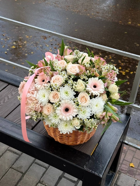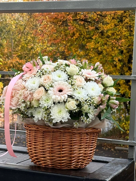 Состав букета: гортензия (1 шт.), гербера (3 шт.), альстромерия (5 шт.), кустовая роза (4 шт.), кустовая хризантема (3 шт.), хамелациум (2 шт.) и корзина.