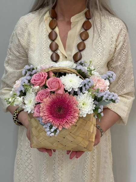 Состав букета: кустовая хризантема (2 шт.), кустовая маттиола (3 шт.), кустовая роза (1 шт.), диантус (3 шт.), статица (1 шт.), гербера (1 шт.) и корзина.