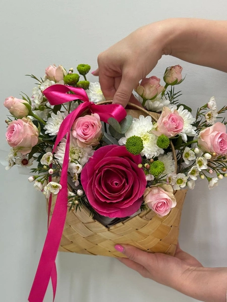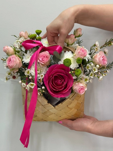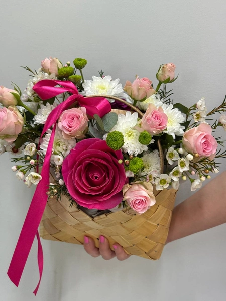 Состав букета: одноголовая роза (1 шт.), кустовая роза (2 шт.), сантини (3 шт.), хамелациум (1 шт.), кустовая хризантема (2 шт.) и корзина.