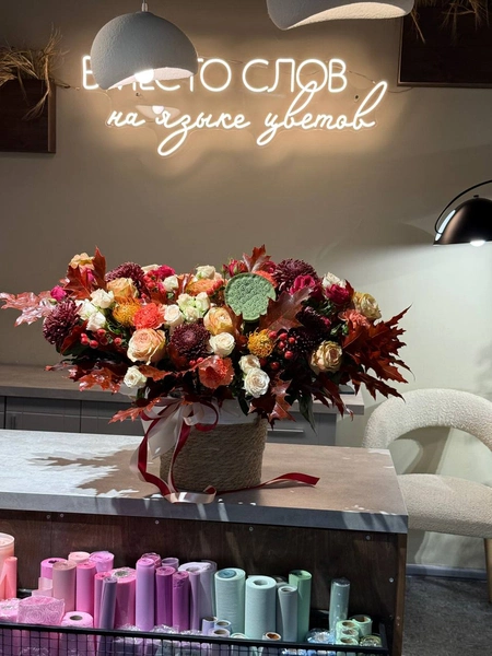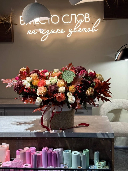 Эта впечатляющая композиция создана, чтобы передать всю теплоту и уют золотой осени. Яркие оттенки бордового, красного, оранжевого и нежного кремового радуют взгляд и согревают душу. Роза, хризантемы, яркие ягоды и воздушные осенние листья создают великолепную композицию. “Осенний шарм” идеально подойдёт для особого случая, чтобы выразить благодарность, тепло или просто поднять настроение любимым. Мы свяжемся с вами в течении 30 минут после оформления заявки. Если заказ необходимо выполнить срочно, перезвоните нам по телефону +79774286477.
